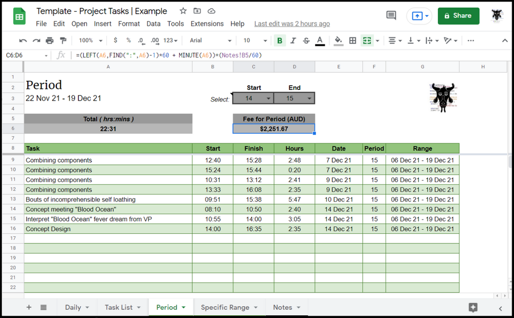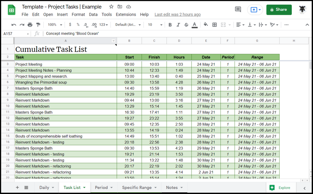Let this Google Sheet do all the heavy lifting. Just enter what you are working on and your start and end time. The Google Sheet will handle the rest.